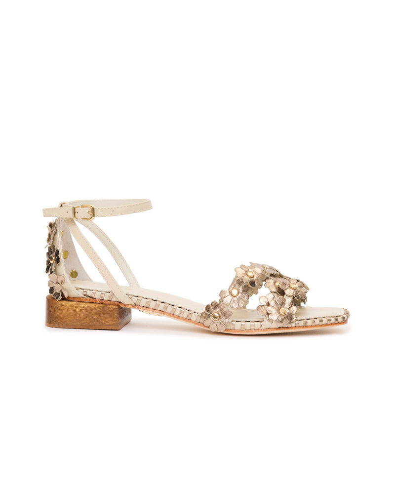 Delicately crafted in genuine leather, this charming sandal features 42 hand-applied daisy appliqués per pair, adding a playful yet elegant touch. The wooden heel brings a natural, earthy feel, while the side piping is finished with fine topstitching for a subtle, artisanal detail.